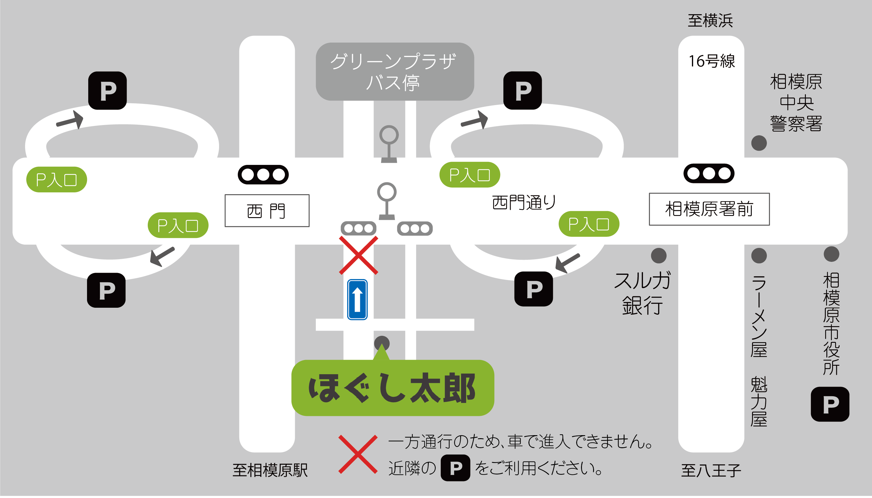 国道16号「相模原警察署前交差点」を、北方面へ曲がり(市役所と逆方向)、西門通りに入って2つ目の信号を左折したところに店舗がありますが、一方通行の為進入できません。【地図へ】